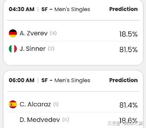 辛納的81.5%和小茲維列夫的18.5%獲勝概率,以及阿爾卡拉斯的81.4%和梅德韋杰夫的18.6%支持率,這種絕對(duì)的碾壓程度,都給人一種無比扎心的感覺。