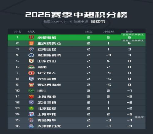 北京時間3月15日,中超第2輪全部戰(zhàn)罷。在兩支球隊負分清零的情況下,積分榜也進一步發(fā)生了變化。