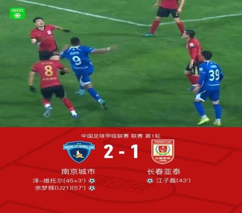 北京時(shí)間3月15日中國(guó)足球甲級(jí)聯(lián)賽 聯(lián)賽 第1輪,南京城市主場(chǎng)對(duì)陣長(zhǎng)春亞泰。上半場(chǎng),江子磊破門(mén)打破場(chǎng)上平衡。補(bǔ)時(shí)階段,澤-維托爾破門(mén)將比分扳平。下半場(chǎng),余夢(mèng)輝破門(mén)將比分反超,隨后雙方再無(wú)建樹(shù)。最終,南京城市2-1逆轉(zhuǎn)長(zhǎng)春亞泰迎來(lái)開(kāi)門(mén)紅。
