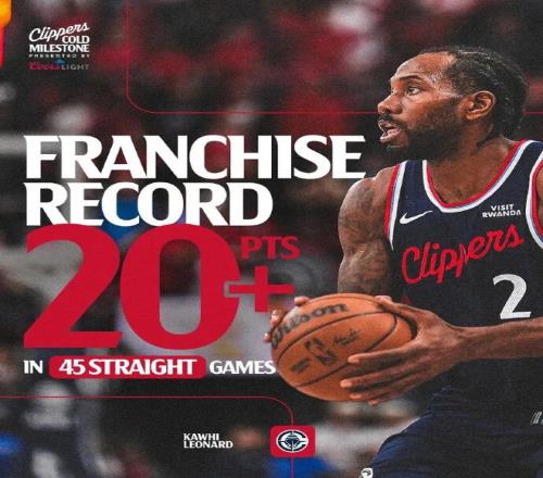 倫納德盡管只打了不到26分鐘,可出手23次中13球砍下31分6板2斷,已經(jīng)連續(xù)45場比賽得分20+創(chuàng)造快船隊史最長紀(jì)錄,之前該紀(jì)錄保持者為1972年榜眼秀鮑勃-麥卡杜。