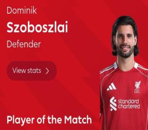 此役主場對陣熱刺,首發(fā)出戰(zhàn)的索博斯洛伊在比賽第18分鐘主罰任意球破門,幫助利物浦取得1-0領(lǐng)先,最終球隊1-1戰(zhàn)平對手。