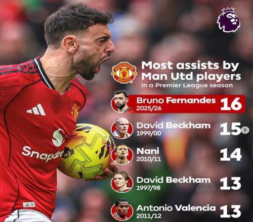 北京時間3月15日22點,25-26賽季英超第30輪曼聯(lián)3-1力克阿斯頓維拉,布魯諾-費爾南德斯送出兩記關(guān)鍵助攻,斬獲本賽季英超16次助攻,打破了由小貝保持26年的曼聯(lián)隊史單賽季英超助攻紀(jì)錄!