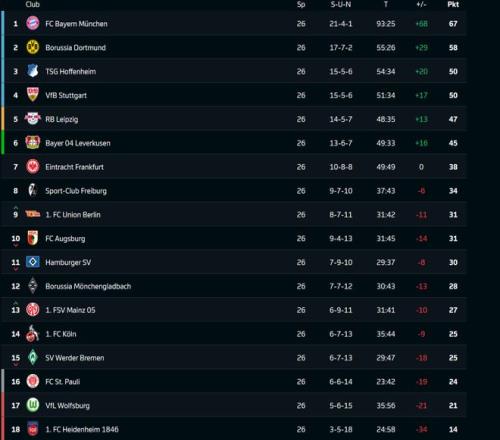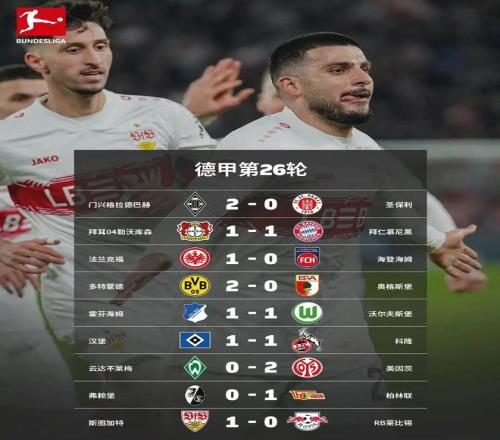 隨著北京時間3月16日凌晨進行的歐冠席位的關(guān)鍵爭奪戰(zhàn)中,斯圖加特1比0力克萊比錫,德甲第26輪全部比賽全部結(jié)束。被罰下2人的拜仁慕尼黑,在客場1比1艱難逼平勒沃庫森;而多特蒙德2比0擊退前來造訪的奧格斯堡,將與拜仁的分差縮小至9分;霍芬海姆戰(zhàn)平沃爾夫斯堡后積50分,而斯圖加特贏球后積分也來到了50分,因凈勝球劣勢屈居第四;RB萊比錫積47分排名第五,勒沃庫森積45分,本輪遺憾錯失了反超萊比錫的機會。