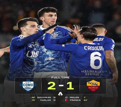 人數(shù)占優(yōu)的科莫隨即展開猛烈進攻。第79分鐘,達庫尼亞右路突破后倒三角回傳,斯莫西奇第一腳射門被斯維拉爾撲出,但皮球落到門前的迭戈·卡洛斯腳下,后者開心撿漏補射再下一城,科莫2-1首次反超羅馬。
