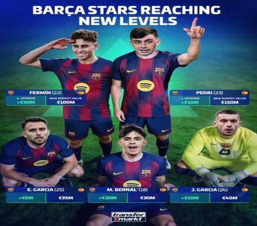 3月16日晚,德國轉會市場更新了部分西甲球員的身價。其中,巴薩中場費爾明暴漲3000萬歐,身價升至1億歐,佩德里上漲1000萬歐,身價1.5億歐。貝林厄姆下降2000萬歐,身價1.4億歐。