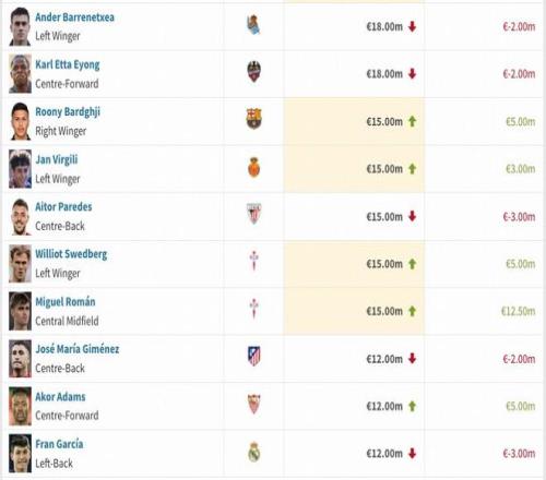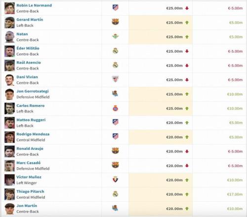 西甲身價更新:費爾明暴漲3000萬歐升至1億,貝林下降2000萬歐