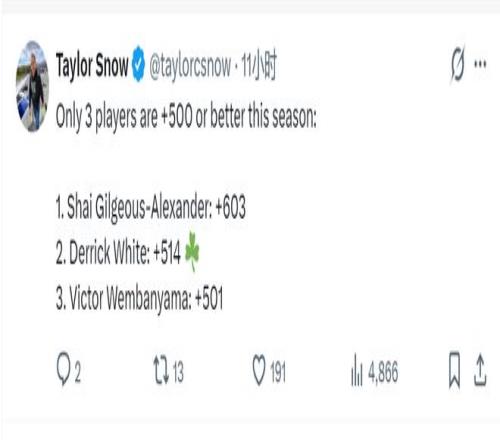 截至今天賽前,全聯盟只有三個球員正負值超過+500:亞歷山大+603,德里克-懷特+514,文班亞馬+501。