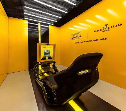 這個空間并不只是一個靜態(tài)展示,百年靈顯然更希望把它做成一種參與式的體驗?,F(xiàn)場設(shè)置了幾組互動裝置,其中就有一個向大眾開放的卡萊拉賽車游戲,讓大家體驗加速、過彎和沖刺時的操控感。