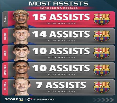 巴薩2025/26賽季隊(duì)內(nèi)助攻最多