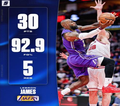 5.詹姆斯成為湖人隊(duì)史03年沙克后首位90%命中率+30分的球員;