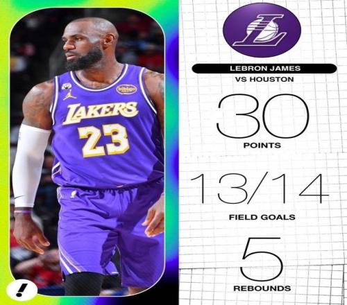 本場比賽,湖人球星詹姆斯上場34分鐘,投籃14投13中,得到30分5籃板2助攻1搶斷1蓋帽。詹姆斯本場的投籃命中率高達92.9%,追平生涯最高紀錄。據(jù)統(tǒng)計,這是詹姆斯生涯第14場比賽在不超過15次出手得到30+分。