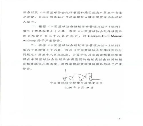 今天四川也吸引了一些目光,但并非什么正面原因。中國(guó)籃球協(xié)會(huì)紀(jì)律與道德委員會(huì)發(fā)布處罰決定:因合同造假、手續(xù)缺失而嚴(yán)重違規(guī),吊銷了張吉驥的經(jīng)紀(jì)人證書(shū);因未依規(guī)辦理手續(xù),對(duì)馬庫(kù)斯·亨特給予嚴(yán)重警告;因未盡注意義務(wù)和手續(xù)缺失,對(duì)四川錦城藍(lán)鯨俱樂(lè)部給予嚴(yán)重警告。