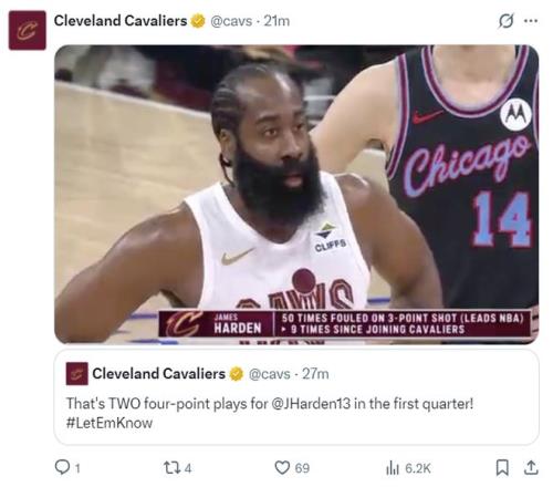 哈登已經(jīng)在三分線外制造50次3+1領(lǐng)跑聯(lián)盟,他到來騎士后已經(jīng)制造了9次3+1,此役上半場就兩個3+1。