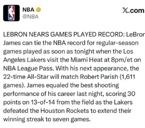 NBA官方祝賀!詹姆斯1611場追平帕里什并列歷史第一稱霸多項紀(jì)錄