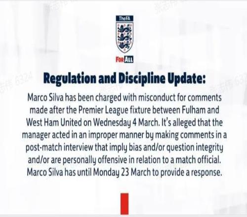 北京時(shí)間3月20日,英格蘭足球總會(huì)官方發(fā)表公告,富勒姆主教練馬爾科-席爾瓦因在對(duì)陣西漢姆聯(lián)的賽后對(duì)裁判發(fā)表不當(dāng)言論被指控,需在3月23日前就相關(guān)指控作出回應(yīng)。