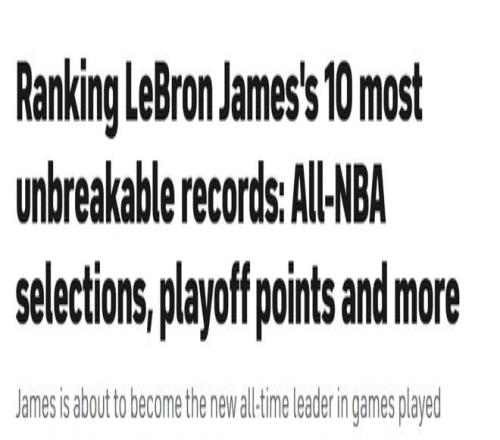 知名美媒CBS評(píng)出了詹姆斯最難被打破的10項(xiàng)紀(jì)錄,倒序揭曉,具體如下——