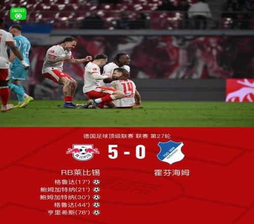 北京時(shí)間3月21日德國(guó)足球頂級(jí)聯(lián)賽 聯(lián)賽 第27輪,RB萊比錫主場(chǎng)對(duì)陣霍芬海姆。RB萊比錫格魯達(dá)梅開(kāi)二度,鮑姆加特納梅開(kāi)二度,亨里希斯破門(mén)。最終比分RB萊比錫 5-0 霍芬海姆。