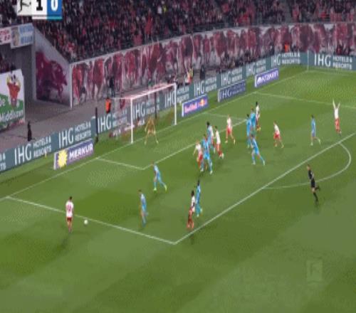 第17分鐘,格魯達(dá)門(mén)前補(bǔ)射破門(mén)先拔頭籌,萊比錫1-0霍芬海姆