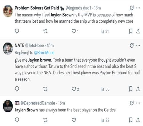 綠凱球迷:1.我之所以認(rèn)為布朗才是MVP,是因?yàn)檫@支球隊(duì)遭遇了重大打擊,布朗帶著全新的陣容依舊是東部勁旅;