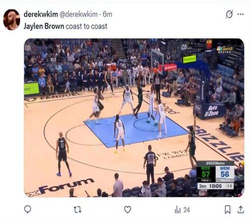 第三節(jié)布朗單節(jié)8中4拿到10分2助攻,三節(jié)打完布朗19中8,三分5中2,罰球8中8,拿到26分5助攻4籃板,而塔圖姆三節(jié)12中2+三分8中2僅拿10分7籃板3失誤,命中率是逆天的16.7%,也因?yàn)樗D姆的糟糕表現(xiàn)灰熊繼續(xù)拉開(kāi)分差。