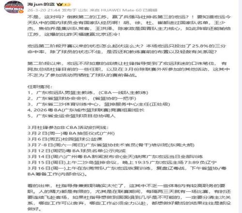 更深層的問(wèn)題,是杜鋒的精力分散。媒體人“海jun的藍(lán)”披露,其身兼五職:廣東宏遠(yuǎn)主教練、廣東省籃協(xié)會(huì)長(zhǎng)、二沙中心籃排服務(wù)中心主任、粵BA競(jìng)賽組副組長(zhǎng)、省全運(yùn)會(huì)籃球總協(xié)調(diào)人。僅三月,他便參與粵BA抽簽、公益課、技術(shù)培訓(xùn)、新聞發(fā)布會(huì)等多場(chǎng)活動(dòng),甚至在3月14日缺席球隊(duì)全天訓(xùn)練,次日即遭遇73-89負(fù)于遼寧。