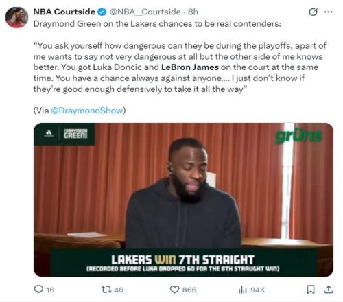 追夢(mèng)格林在評(píng)價(jià)如今這支湖人時(shí)他的說法是東契奇、詹姆斯讓湖人變得危險(xiǎn),他的原話是:你會(huì)問他們?cè)诩竞筚惸苡卸辔kU(xiǎn),一方面我會(huì)覺得他們可能沒那么危險(xiǎn),但另一部分的我知道事情沒那么簡(jiǎn)單。當(dāng)東契奇和勒布朗同時(shí)在場(chǎng)上時(shí),你對(duì)任何對(duì)手都始終有機(jī)會(huì)……”