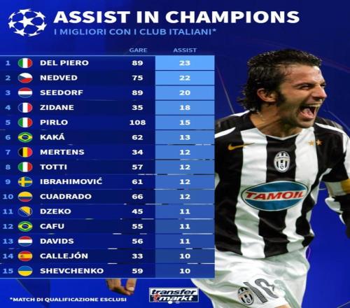 意甲球員歐冠歷史助攻榜TOP15: