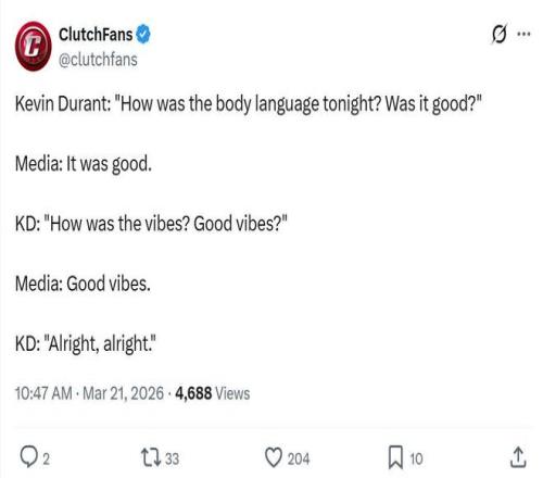 在打出這樣的表現(xiàn),率隊大勝老鷹終結(jié)對手11連勝后,杜蘭特賽后面對記者時主動提問自己本場與隊友的肢體語言怎么樣?球隊氛圍好不好?