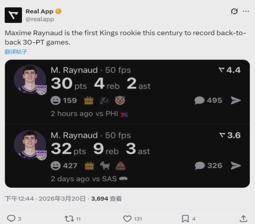 國(guó)王新秀馬克西姆-雷諾爆發(fā)了,過(guò)去兩場(chǎng)分別砍下30分4板2助1帽和32分9板3助1帽。雷諾成為進(jìn)入21世紀(jì)以來(lái),國(guó)王隊(duì)史第一個(gè)連續(xù)兩場(chǎng)30+的新秀,強(qiáng)如考辛斯都沒(méi)做到。最新一期的NBA官方新秀榜,雷諾已經(jīng)升至第四名了。