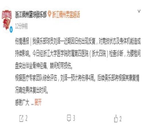 浙江男籃官宣:頂薪劉澤一腰椎間盤突出伴坐骨神經(jīng)痛傷停4周